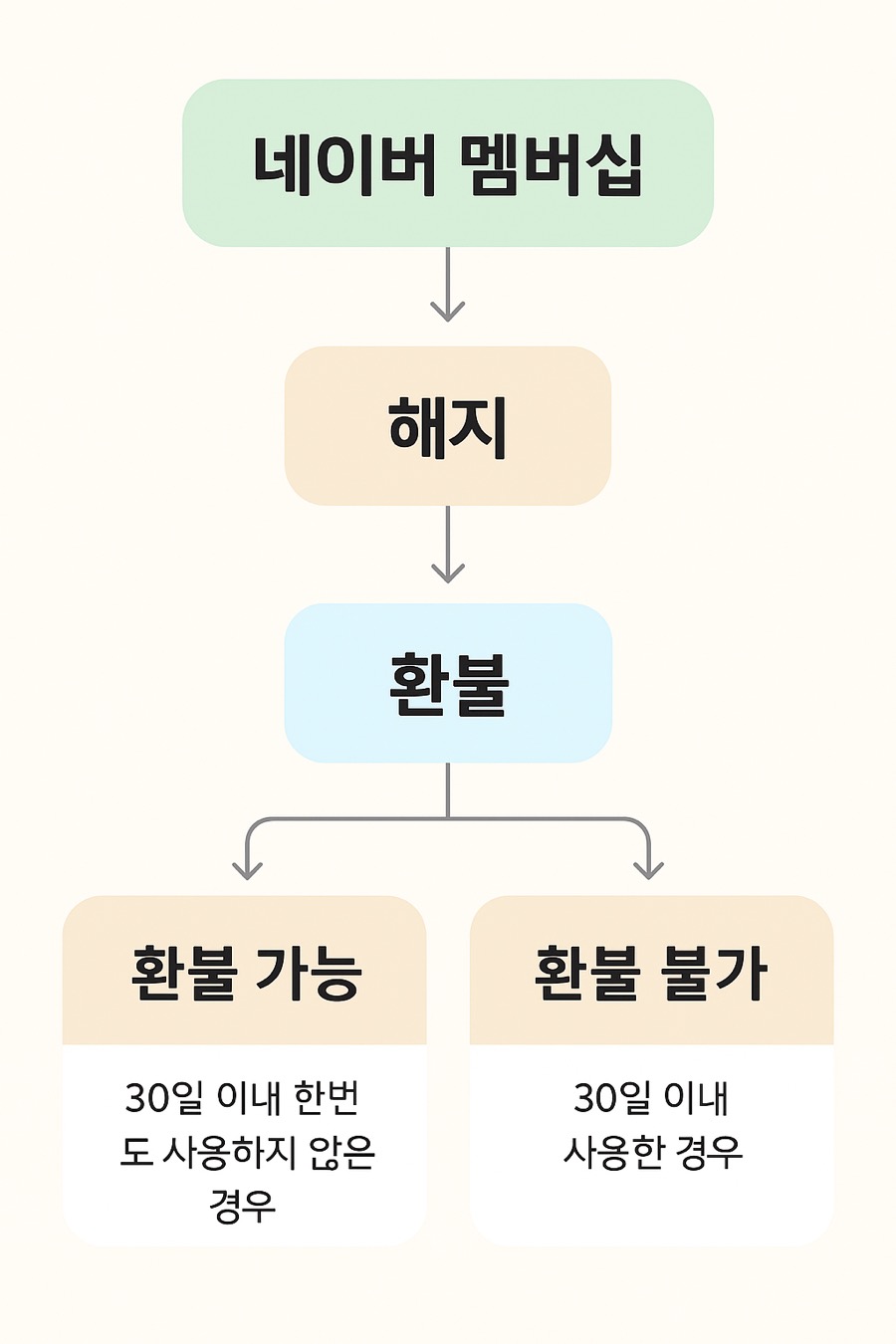 멤버십 혜택으로 적립된 네이버페이 포인트는 해지 후 1년 이내 미사용 시 자동 소멸됩니다. 환불 전 포인트를 미리 사용해두는 게 안전합니다.